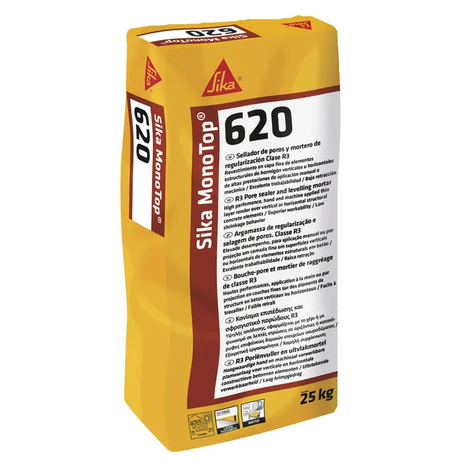 Sika MonoTop®-620 é uma argamassa modificada com polímeros para acabamento em reparações estruturais. Cumpre os requisitos da classe R3 da norma EN 1504-3.